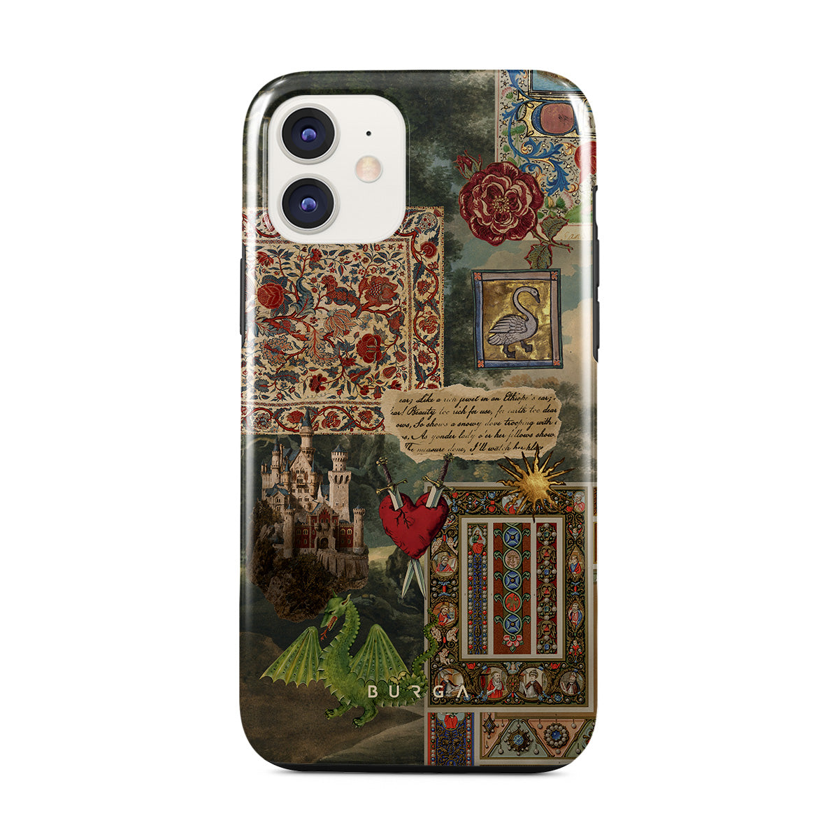 This design features: handwritten calligraphy font, vintage print, medieval design, floral pattern, old book illustrations, heart, dragon, castle