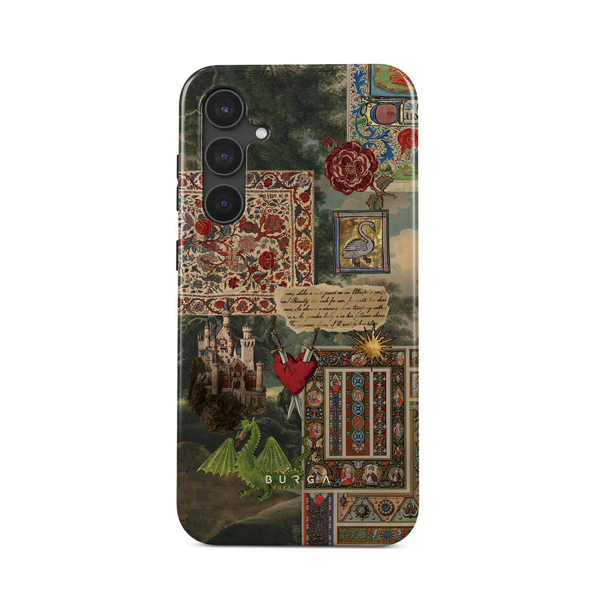 This design features: handwritten calligraphy font, vintage print, medieval design, floral pattern, old book illustrations, heart, dragon, castle