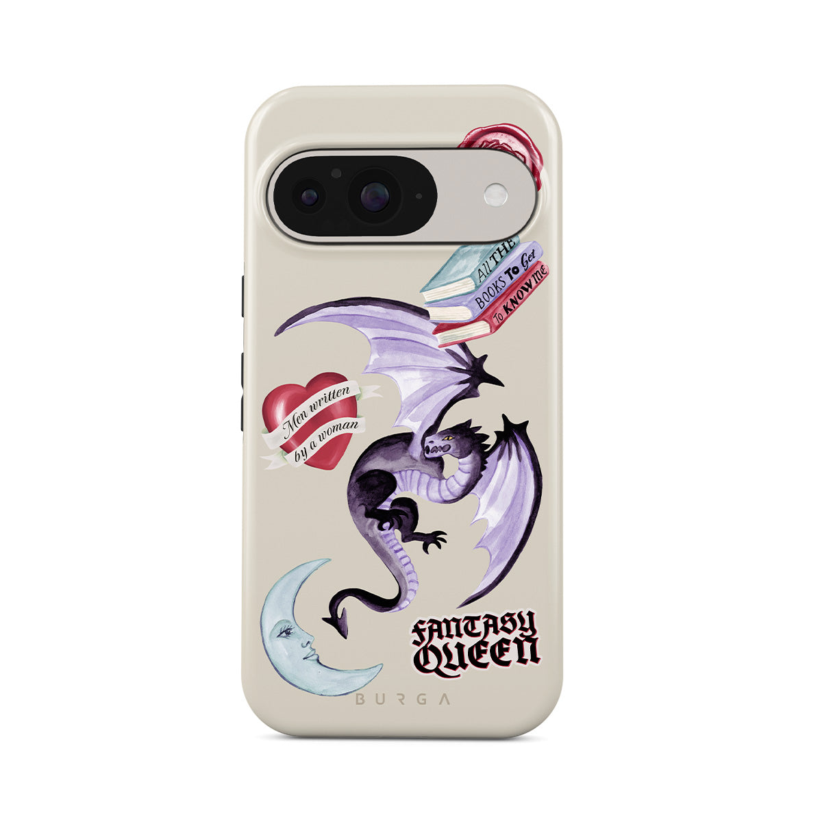 This design features: purple dragon, "Fantasy Queen" sticker, crescent moon, purple wax seal, heart with message, books