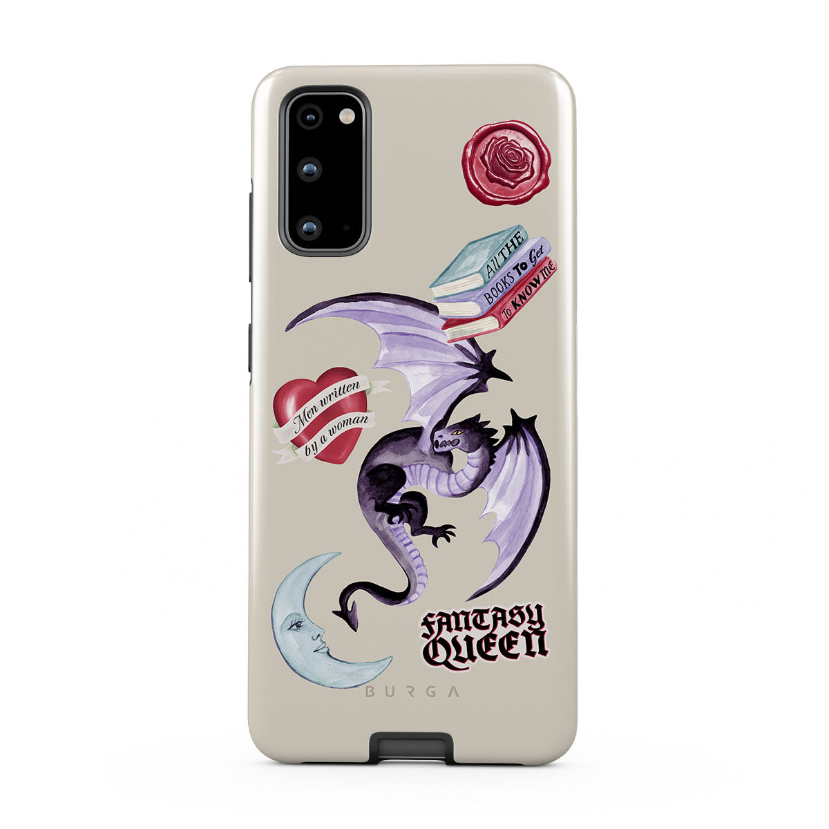 This design features: purple dragon, "Fantasy Queen" sticker, crescent moon, purple wax seal, heart with message, books