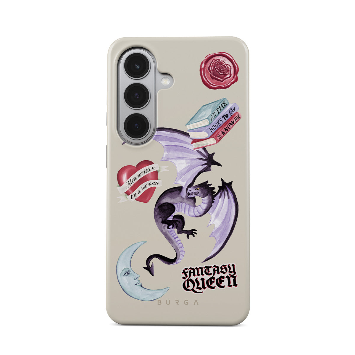 This design features: purple dragon, "Fantasy Queen" sticker, crescent moon, purple wax seal, heart with message, books