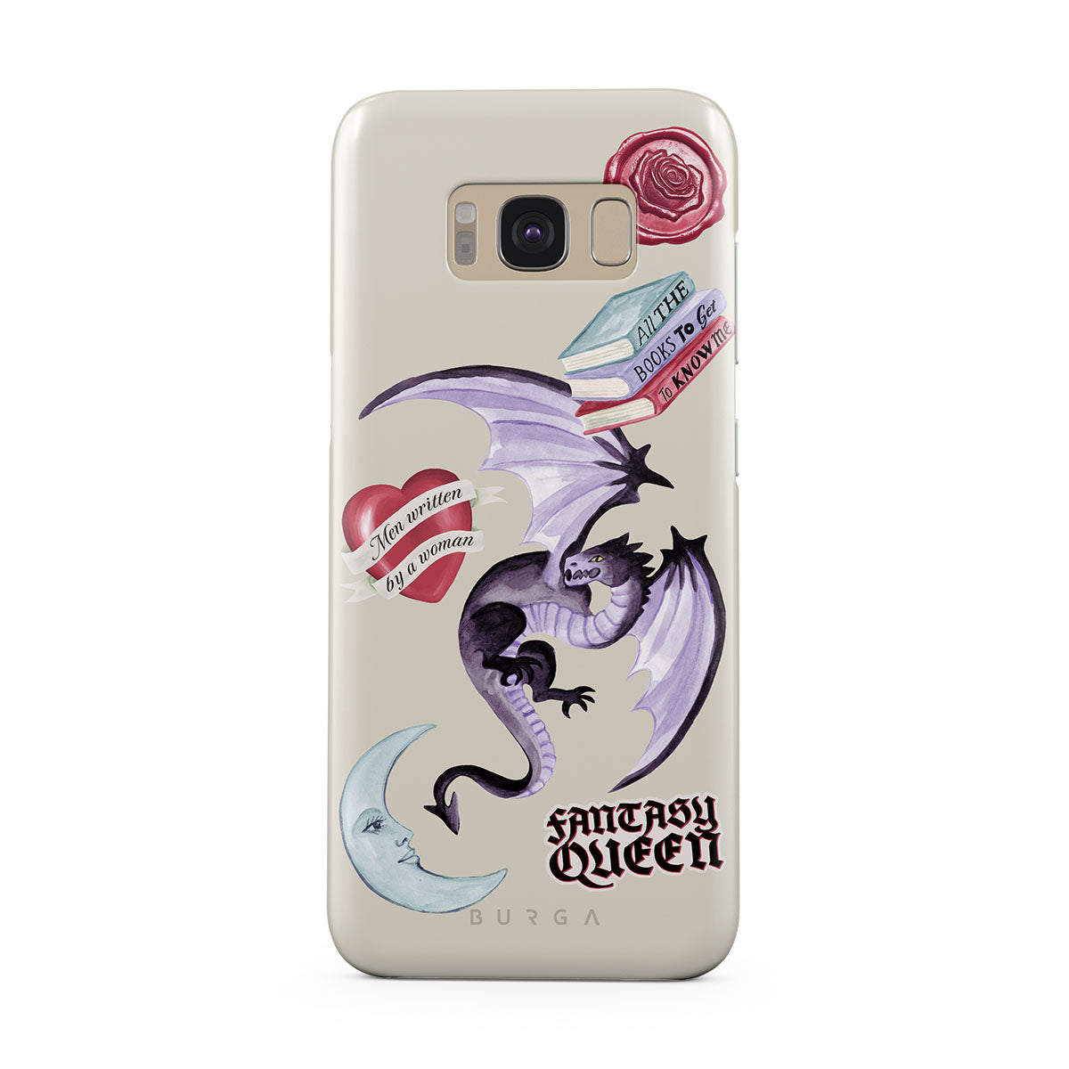 This design features: purple dragon, "Fantasy Queen" sticker, crescent moon, purple wax seal, heart with message, books