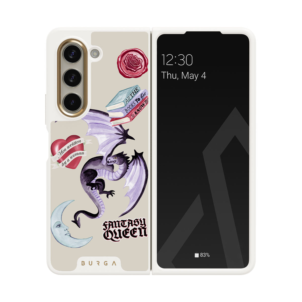 This design features: purple dragon, "Fantasy Queen" sticker, crescent moon, purple wax seal, heart with message, books