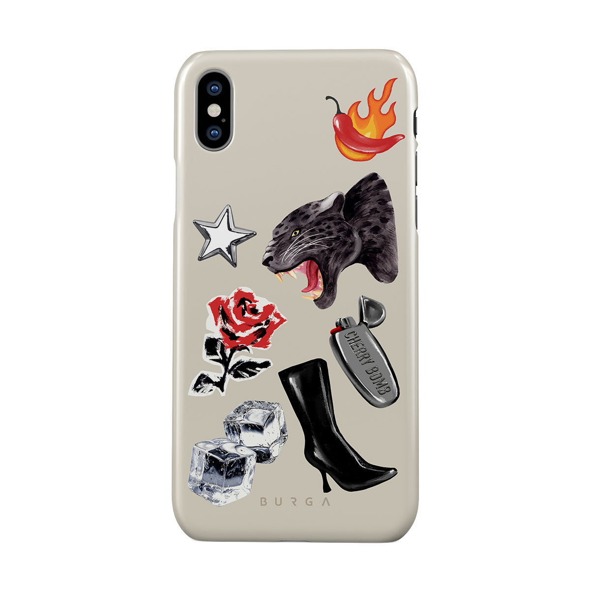 This design features: black panther, red rose, burning bell pepper, silver lighter, black knee-high boots, ice cubes, silver star