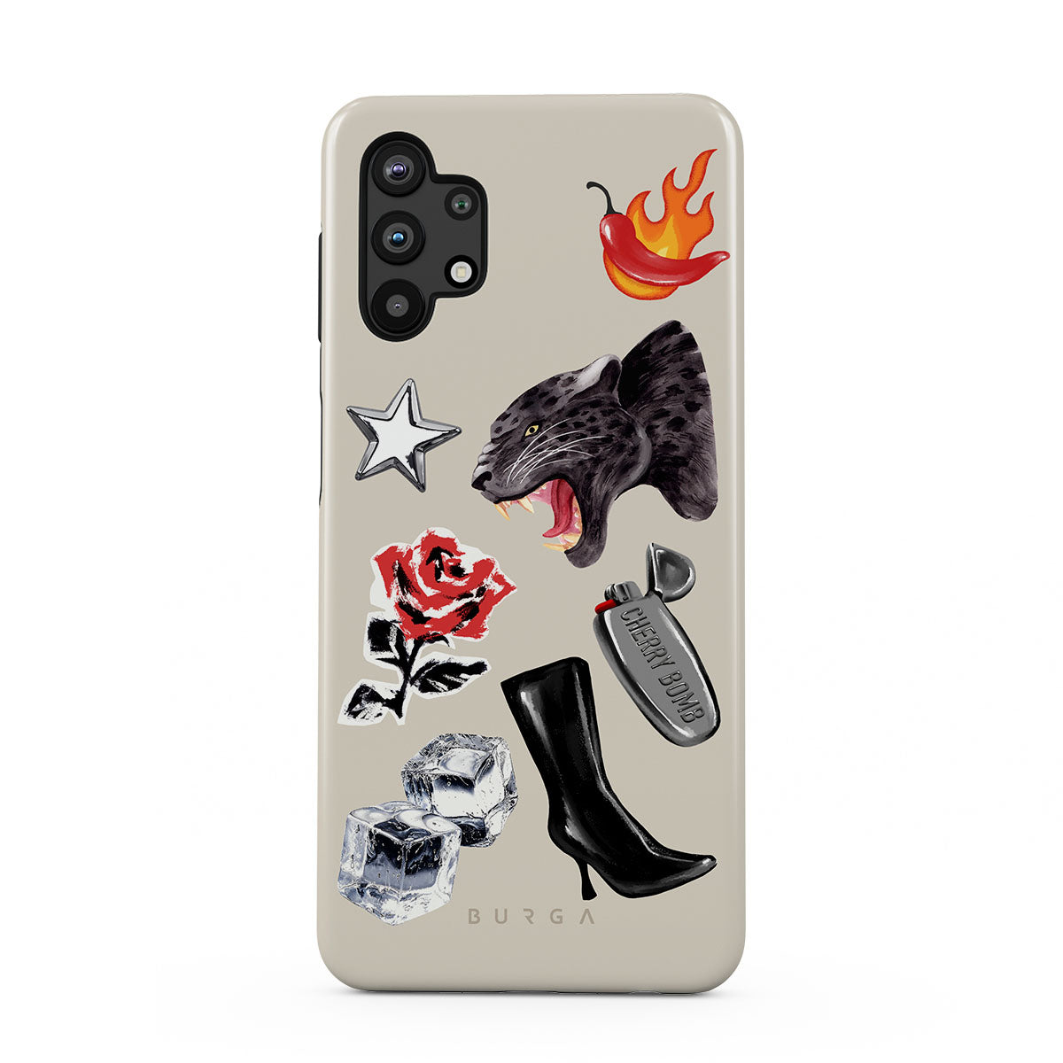 This design features: black panther, red rose, burning bell pepper, silver lighter, black knee-high boots, ice cubes, silver star