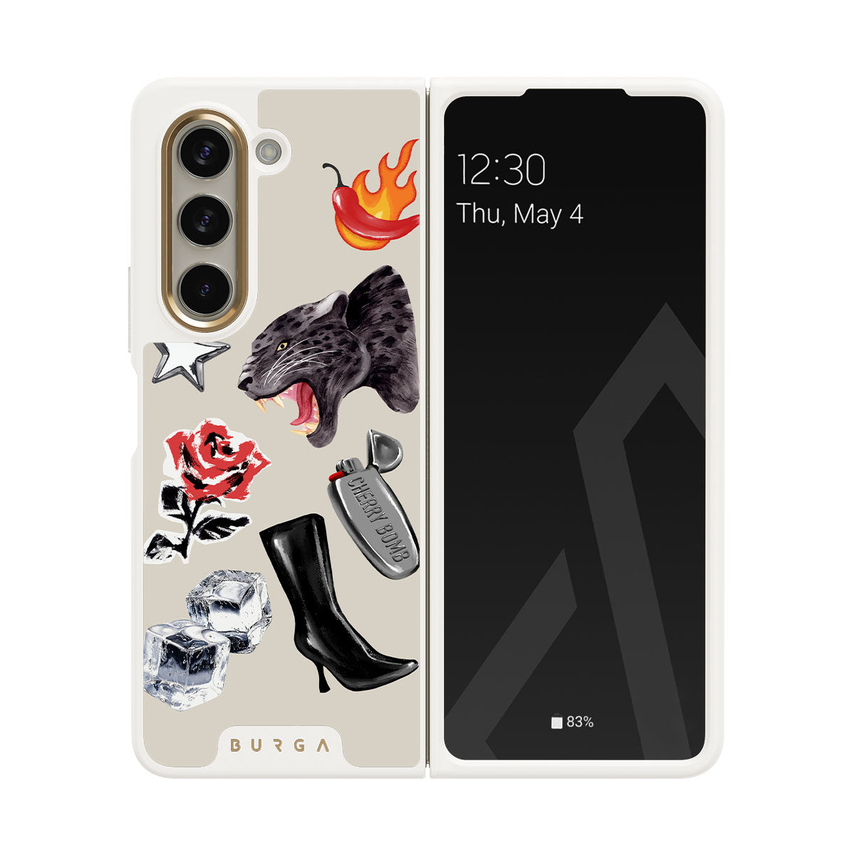 This design features: black panther, red rose, burning bell pepper, silver lighter, black knee-high boots, ice cubes, silver star