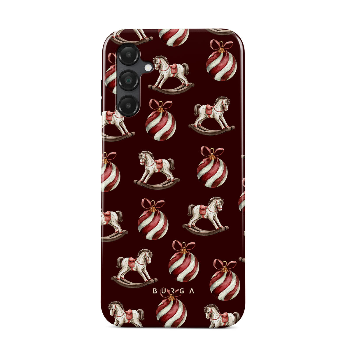 Jingle all the way with this playful Samsung Galaxy A25 phone case design. Featuring rocking horses and candy-striped bells, our Rocking Around design transports you back to childhood moments of decorating the tree and waiting for Santa. It’s the ultimate throwback to vintage Christmas charm.