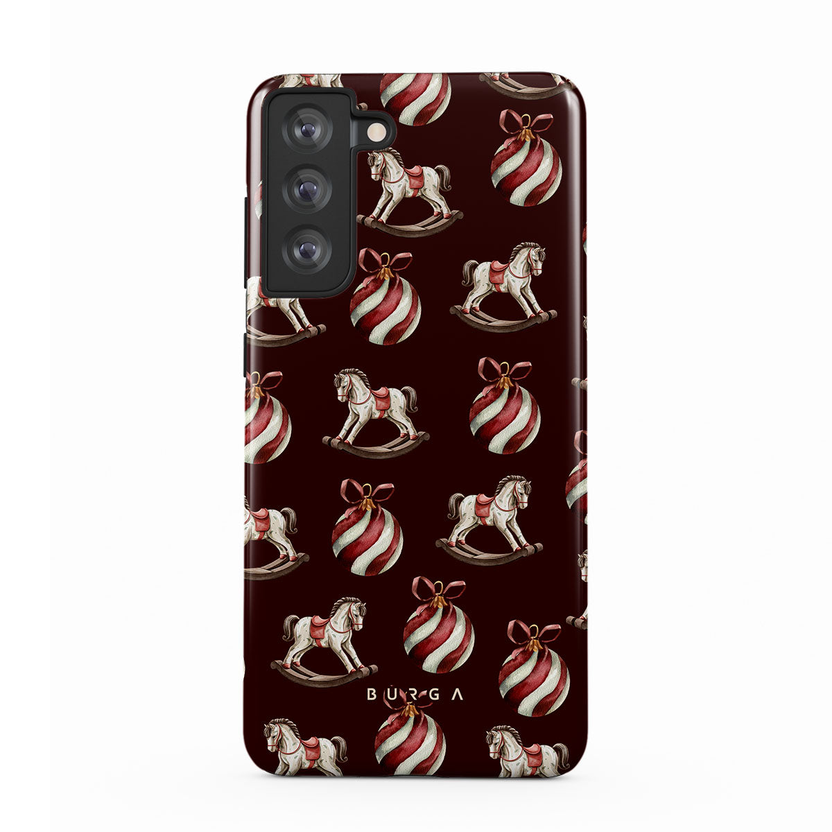 Jingle all the way with this playful Samsung Galaxy S21 FE phone case design. Featuring rocking horses and candy-striped bells, our Rocking Around design transports you back to childhood moments of decorating the tree and waiting for Santa. It’s the ultimate throwback to vintage Christmas charm.