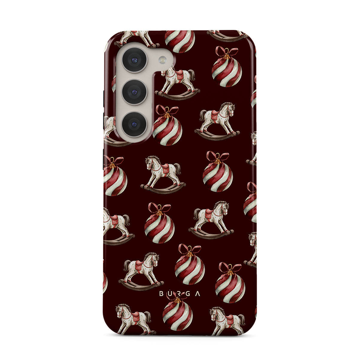 Jingle all the way with this playful Samsung Galaxy S23 phone case design. Featuring rocking horses and candy-striped bells, our Rocking Around design transports you back to childhood moments of decorating the tree and waiting for Santa. It’s the ultimate throwback to vintage Christmas charm.