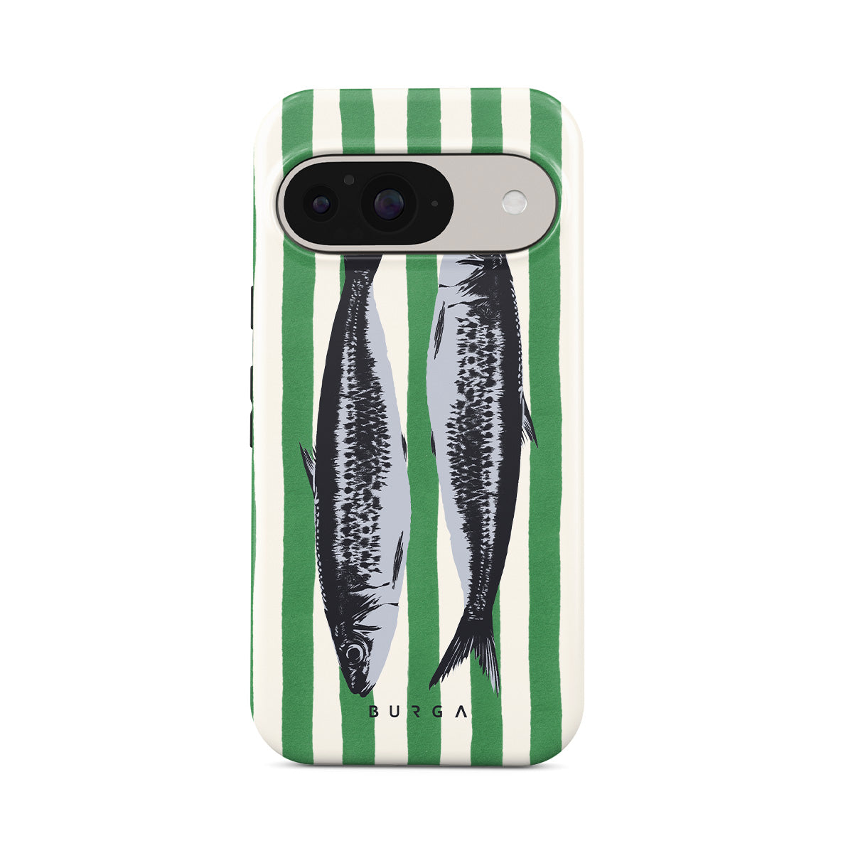 This design features: Sardines, green stripes, ocean motifs
