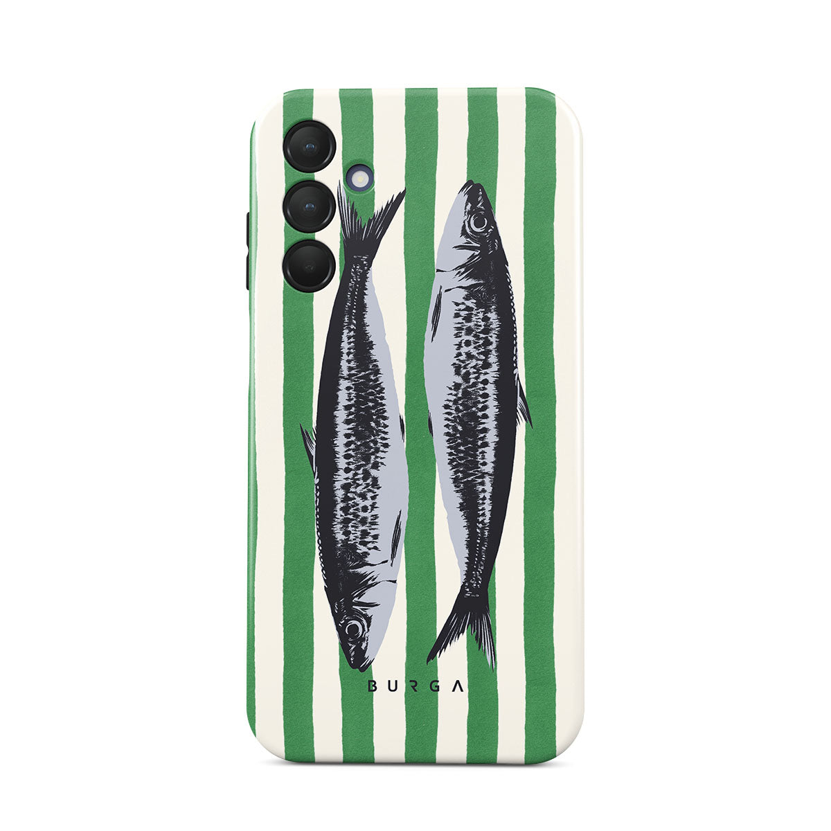This design features: Sardines, green stripes, ocean motifs
