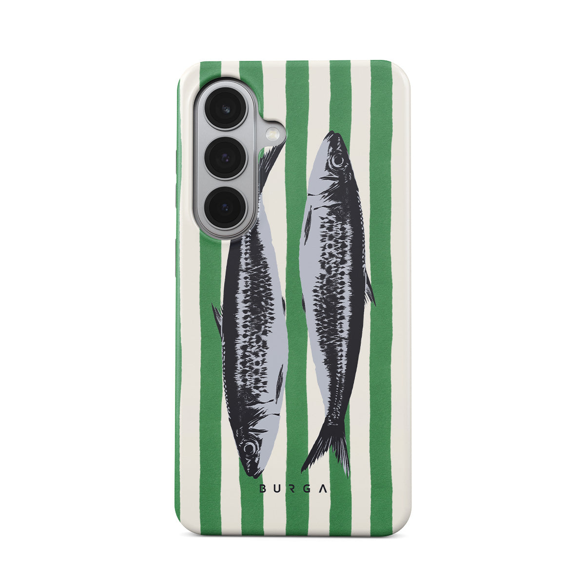 This design features: Sardines, green stripes, ocean motifs