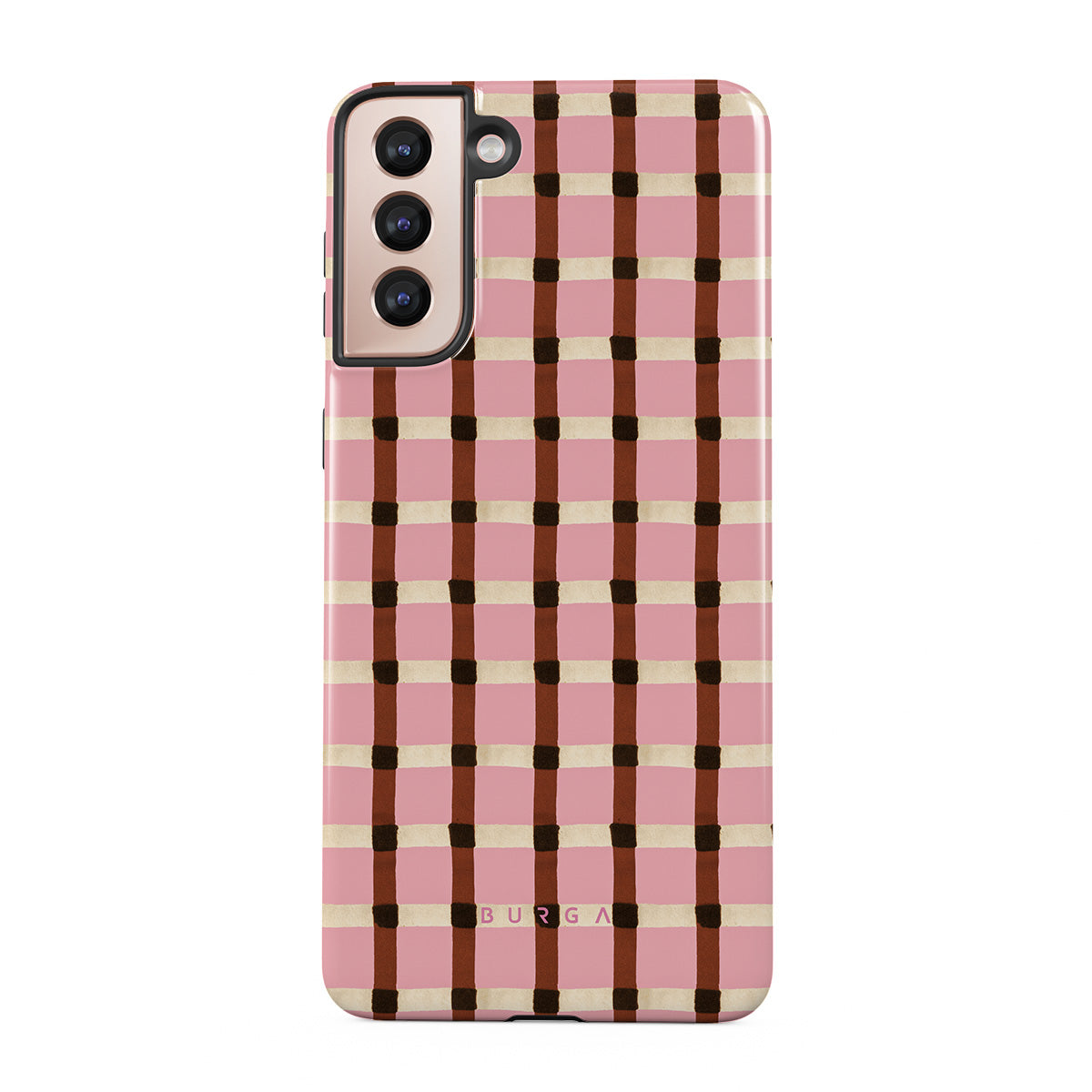 This design features: pink and brown checkered pattern, gingham pattern