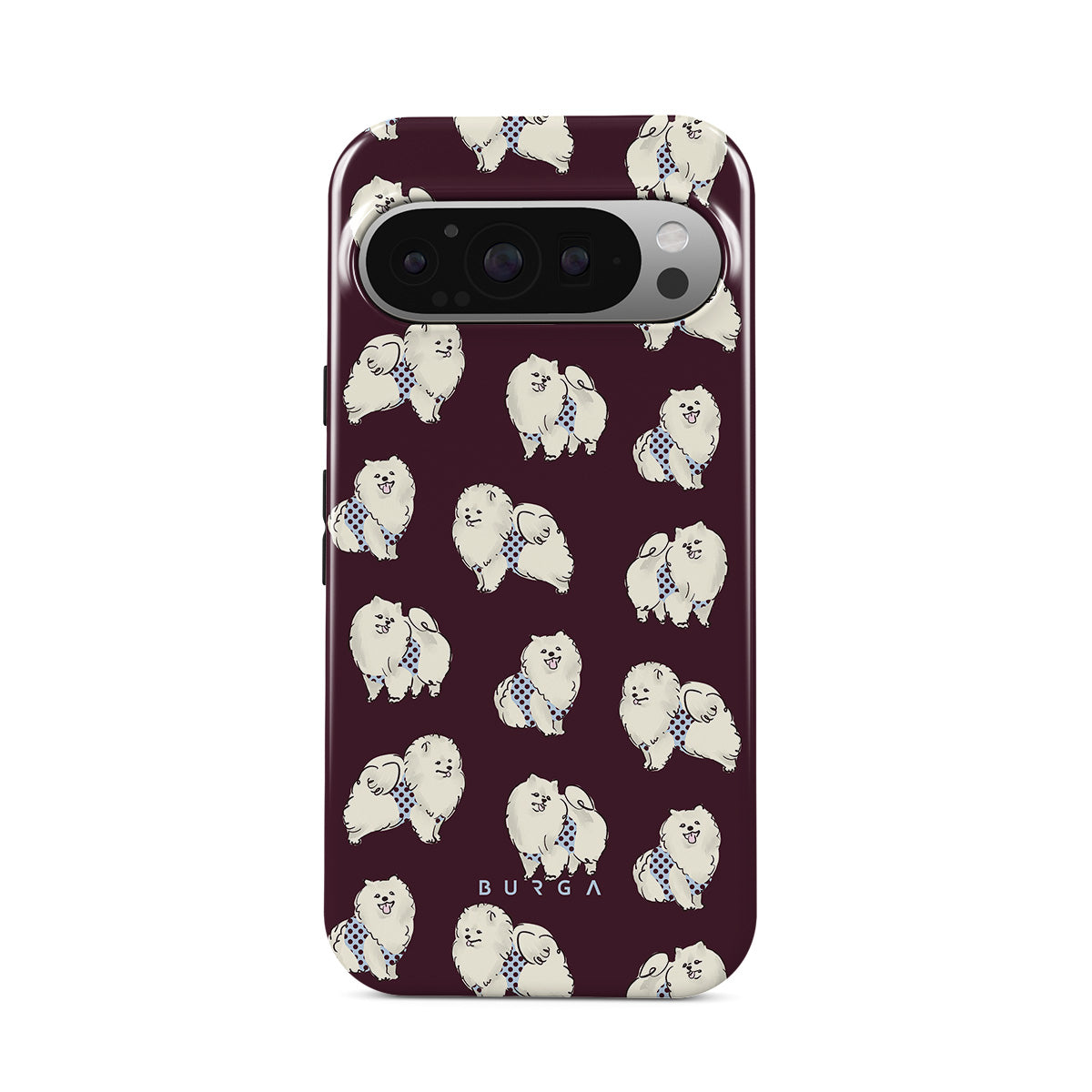 This design features: white fluffy dogs on a deep burgundy background, poodles, pets.