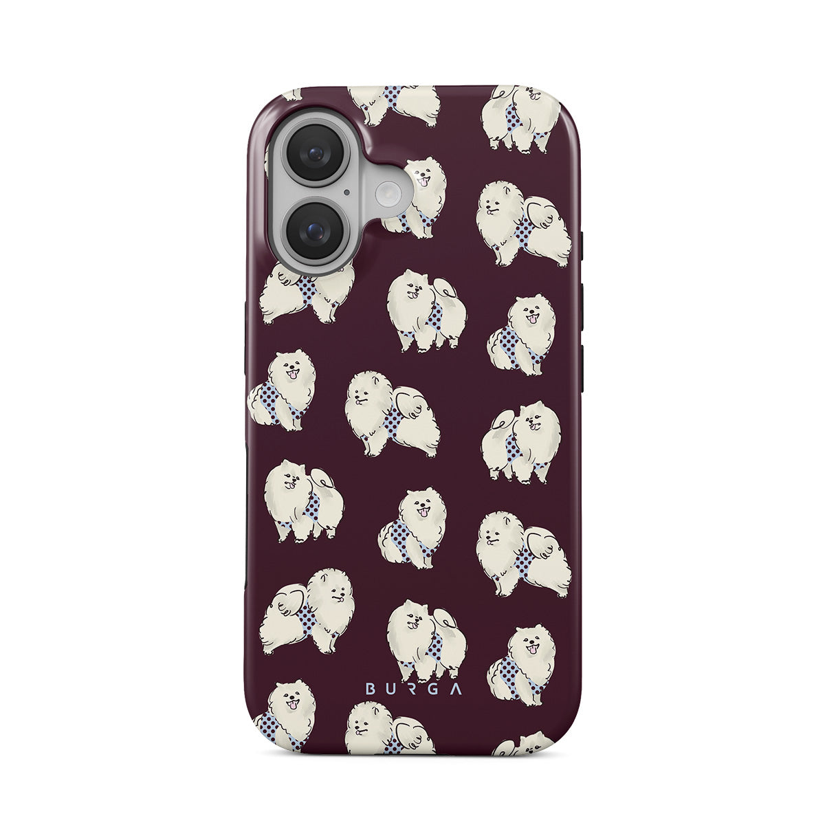 This design features: white fluffy dogs on a deep burgundy background, poodles, pets.
