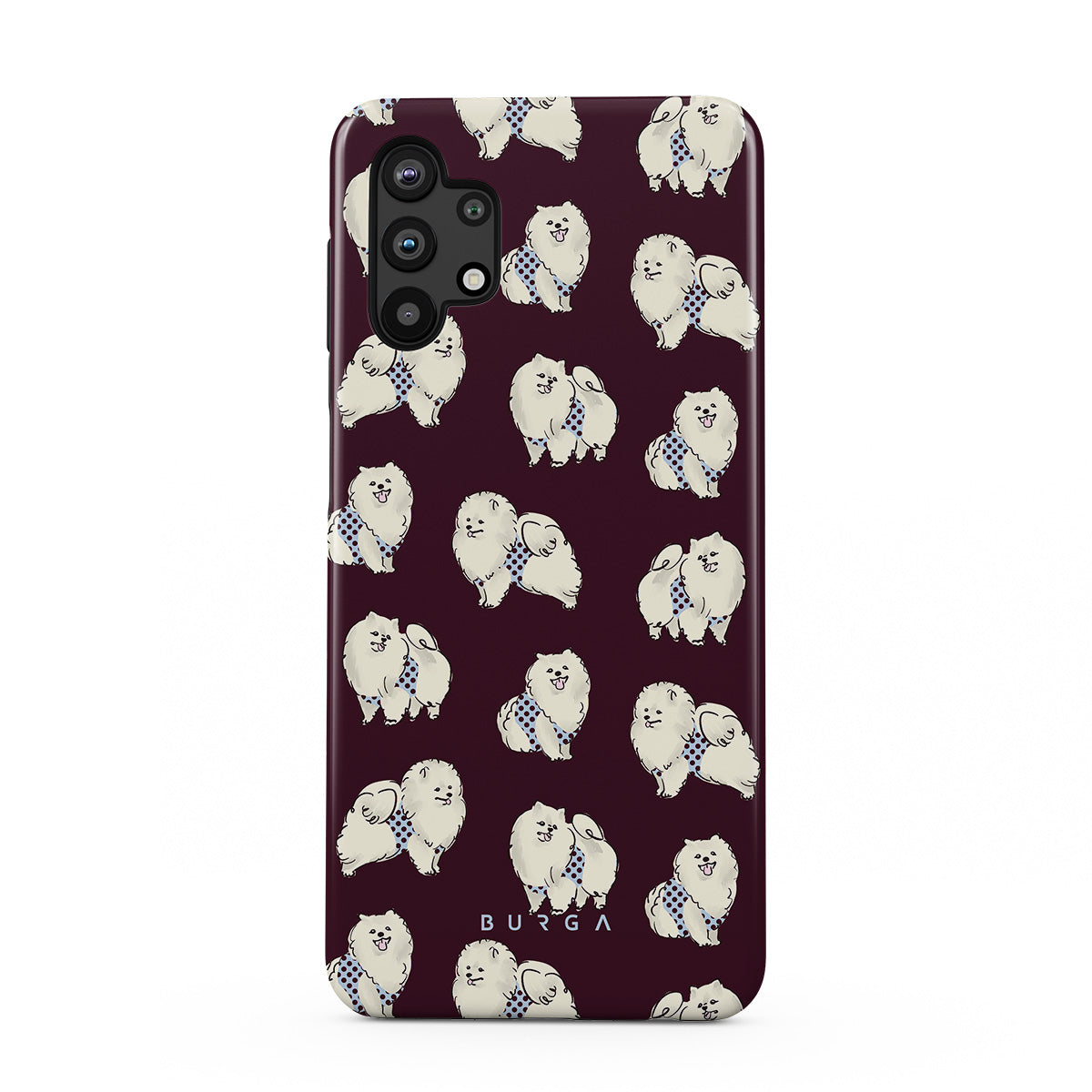 This design features: white fluffy dogs on a deep burgundy background, poodles, pets.