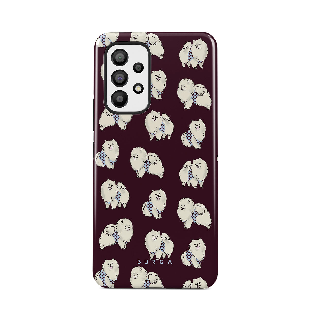 This design features: white fluffy dogs on a deep burgundy background, poodles, pets.