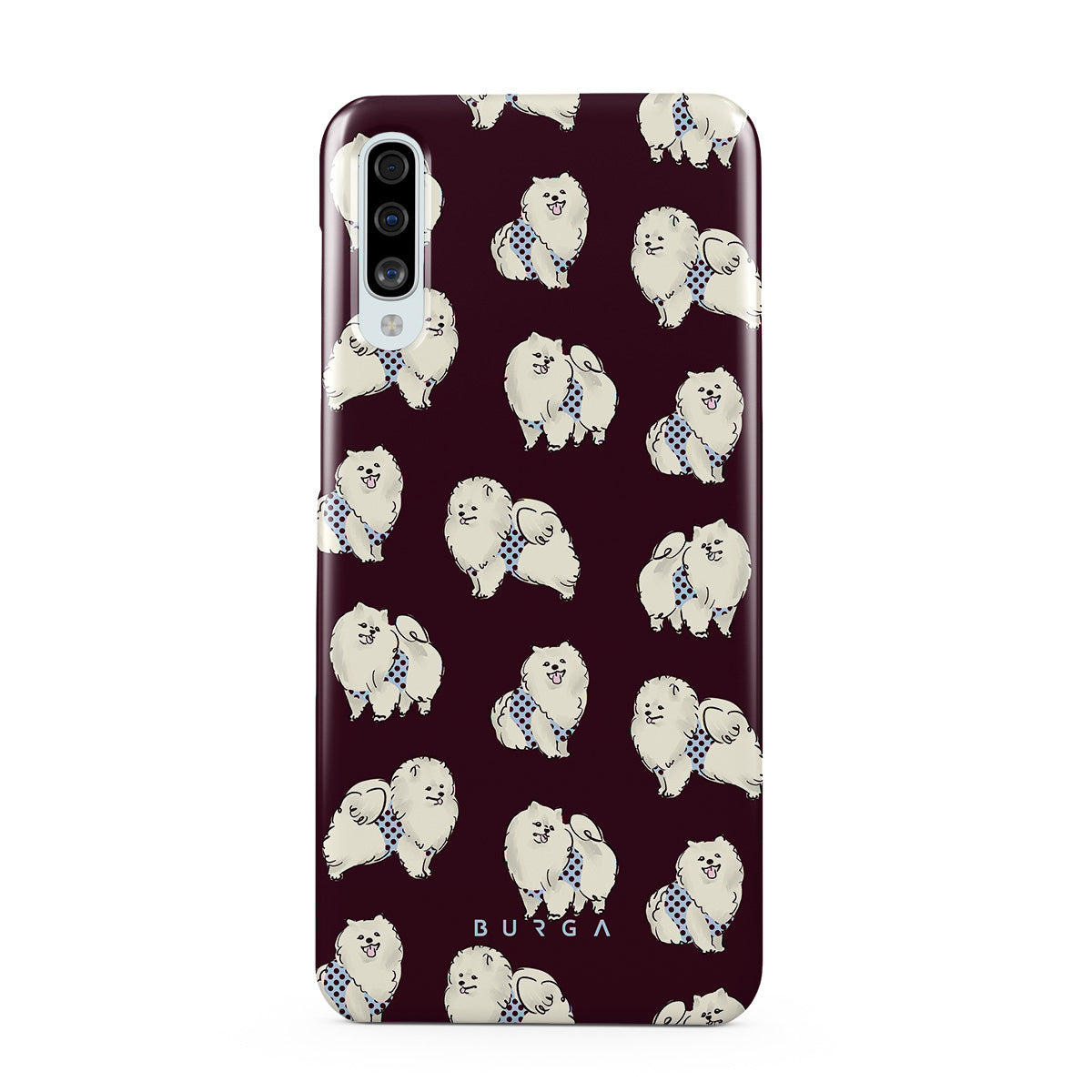 This design features: white fluffy dogs on a deep burgundy background, poodles, pets.