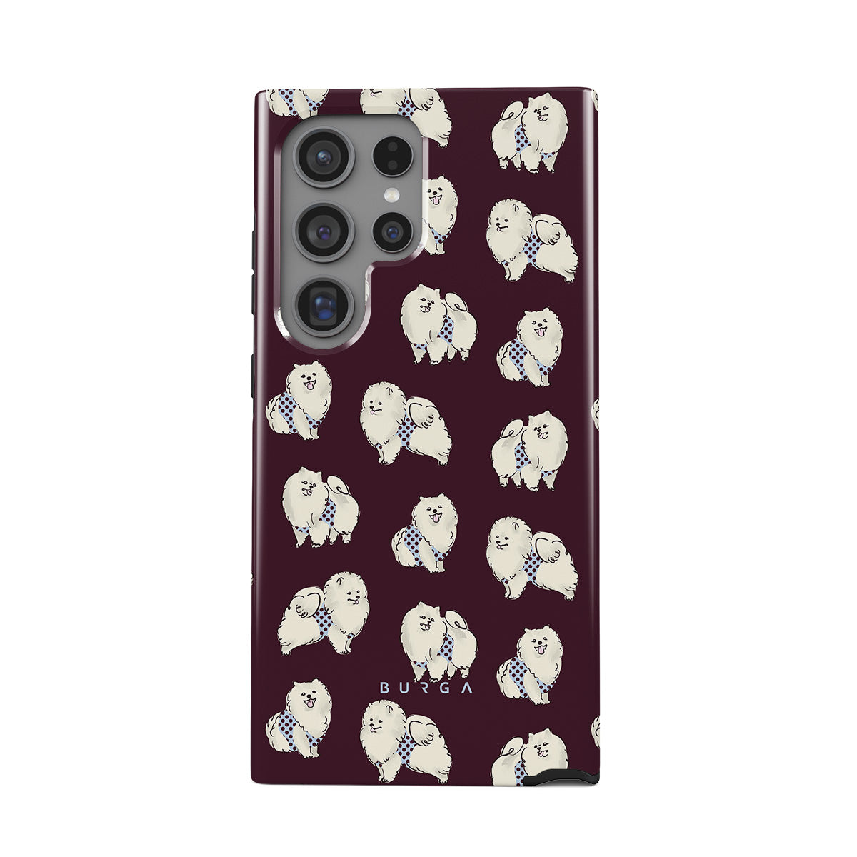 This design features: white fluffy dogs on a deep burgundy background, poodles, pets.