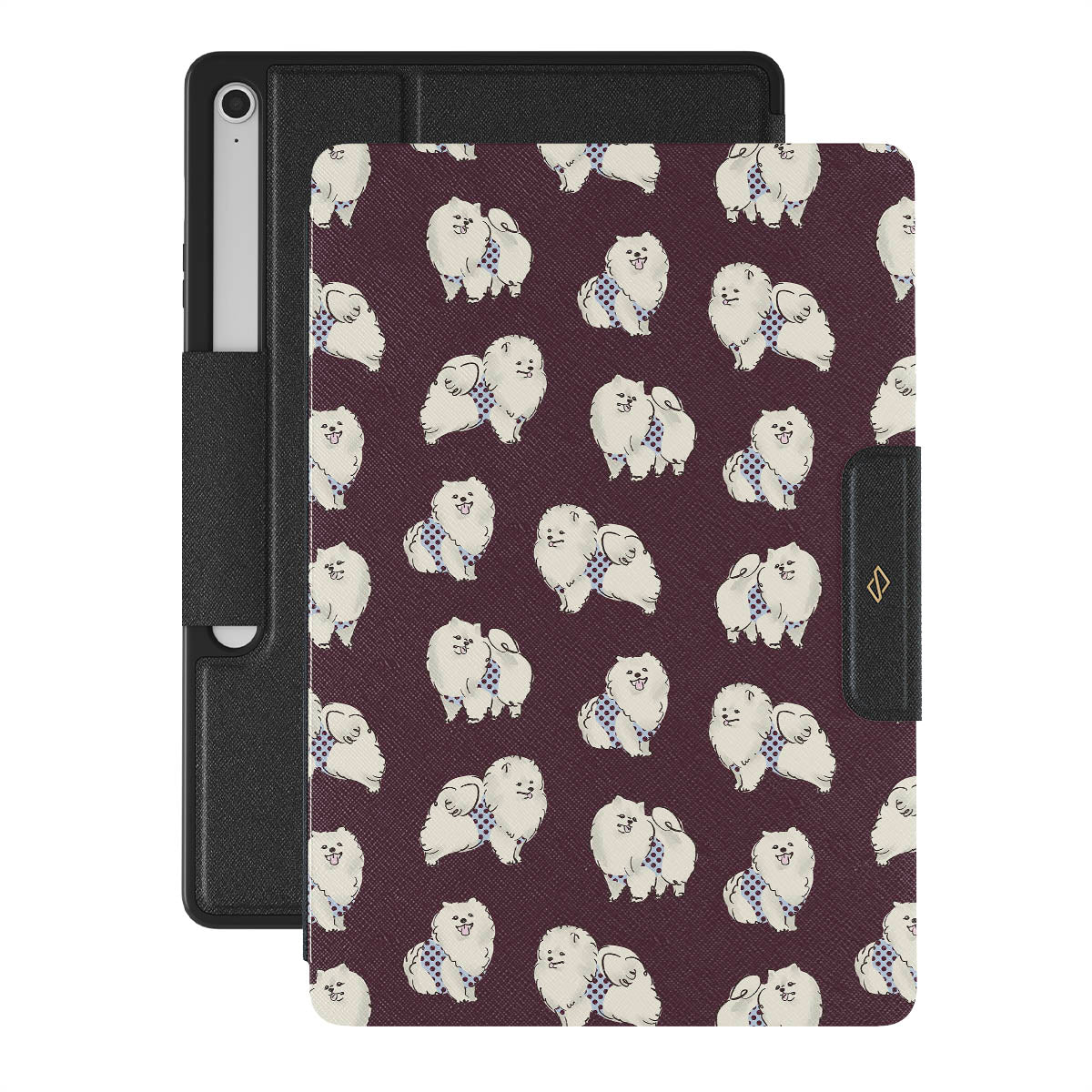This design features: white fluffy dogs on a deep burgundy background, poodles, pets.