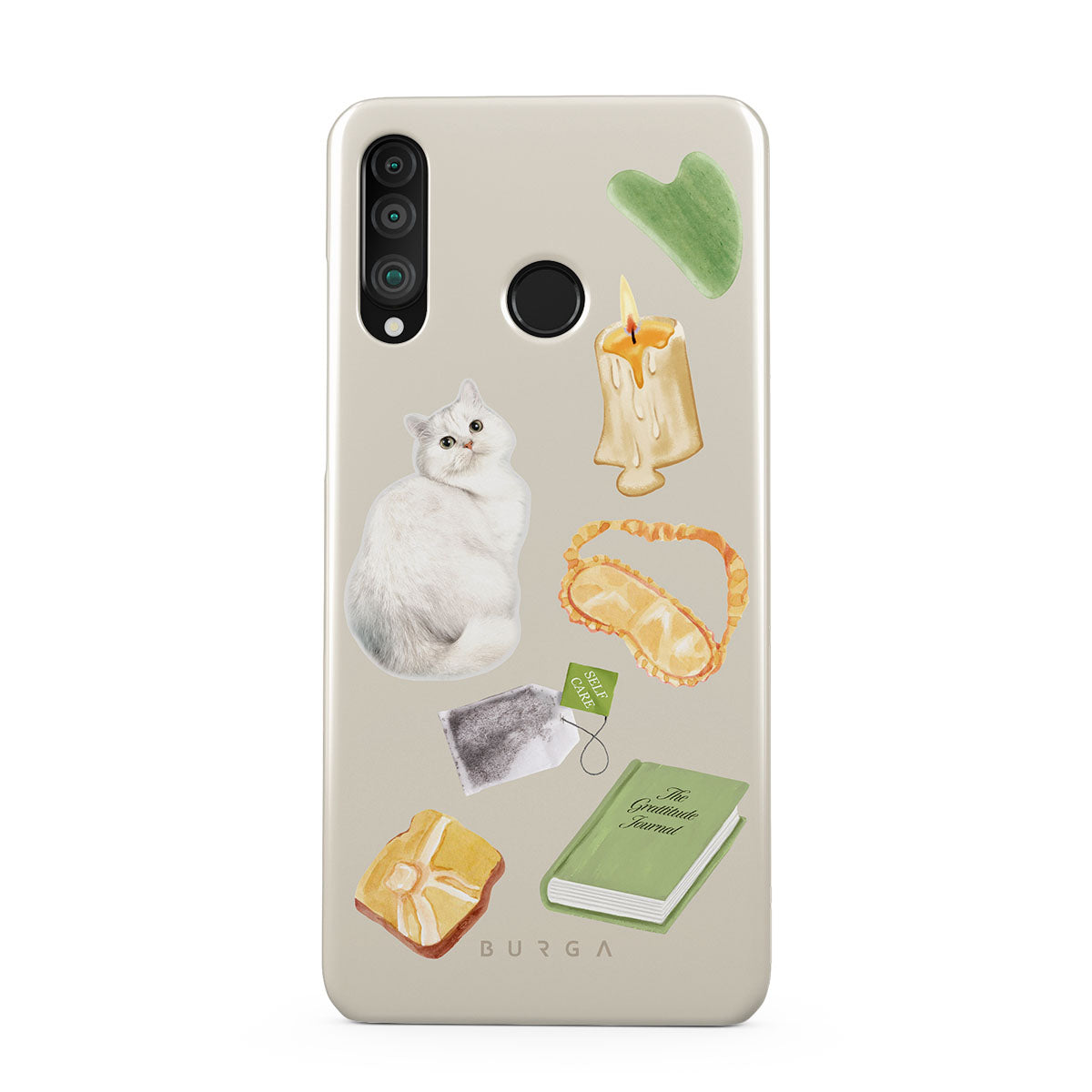 This design features: white cat, green book, candle, Gua Sha bar, sleeping mask, tea bag, yellow crystal