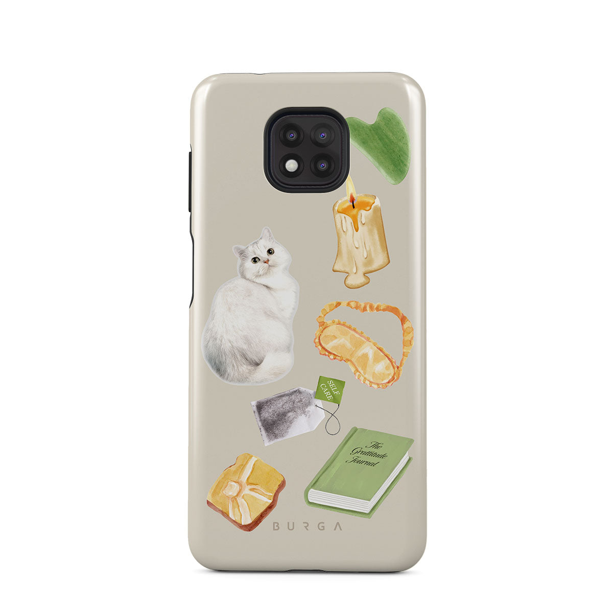 This design features: white cat, green book, candle, Gua Sha bar, sleeping mask, tea bag, yellow crystal