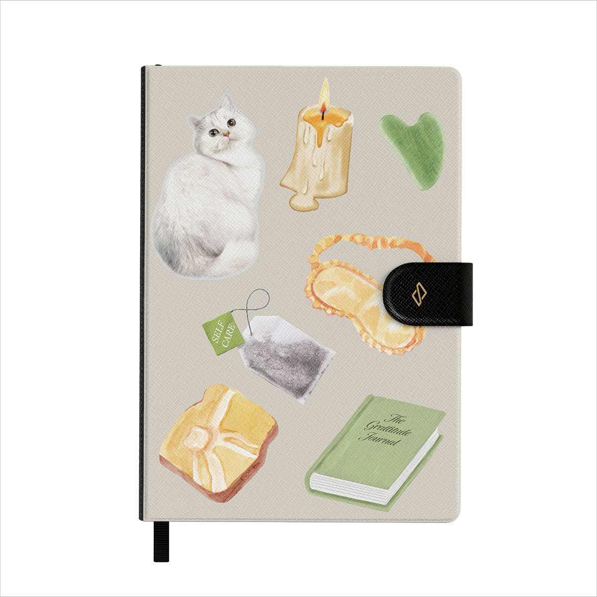 This design features: white cat, green book, candle, Gua Sha bar, sleeping mask, tea bag, yellow crystal.