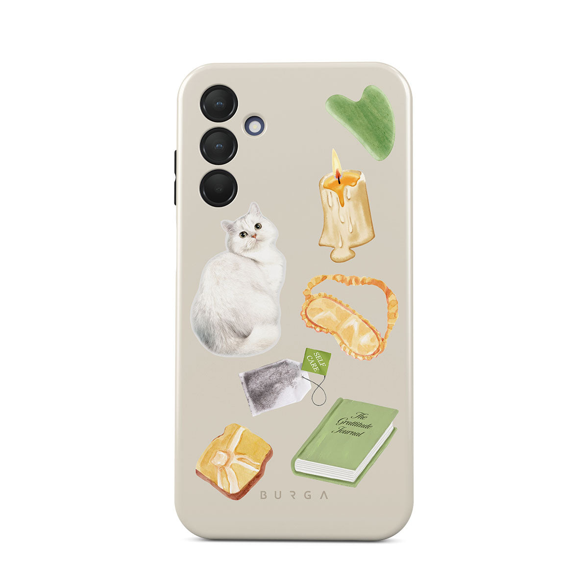 This design features: white cat, green book, candle, Gua Sha bar, sleeping mask, tea bag, yellow crystal