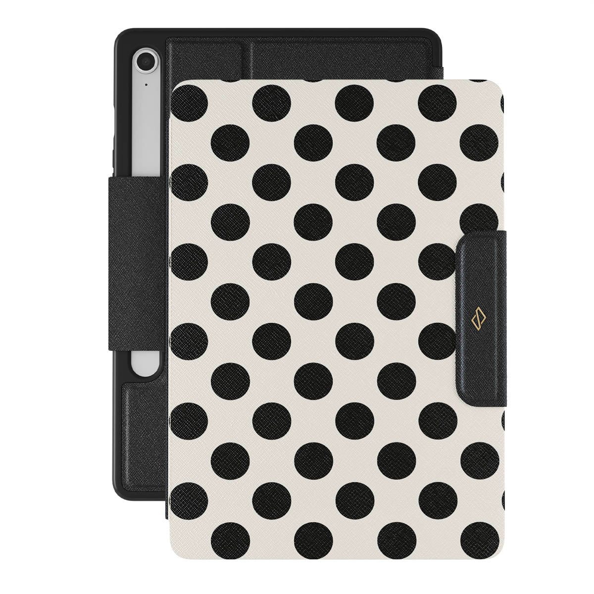 This design features: black polka dots on a clean white background.