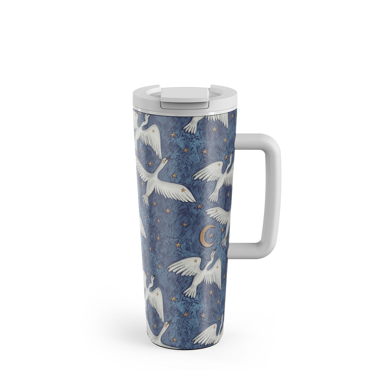 This design features: stars and moons, white doves, dark blue sky