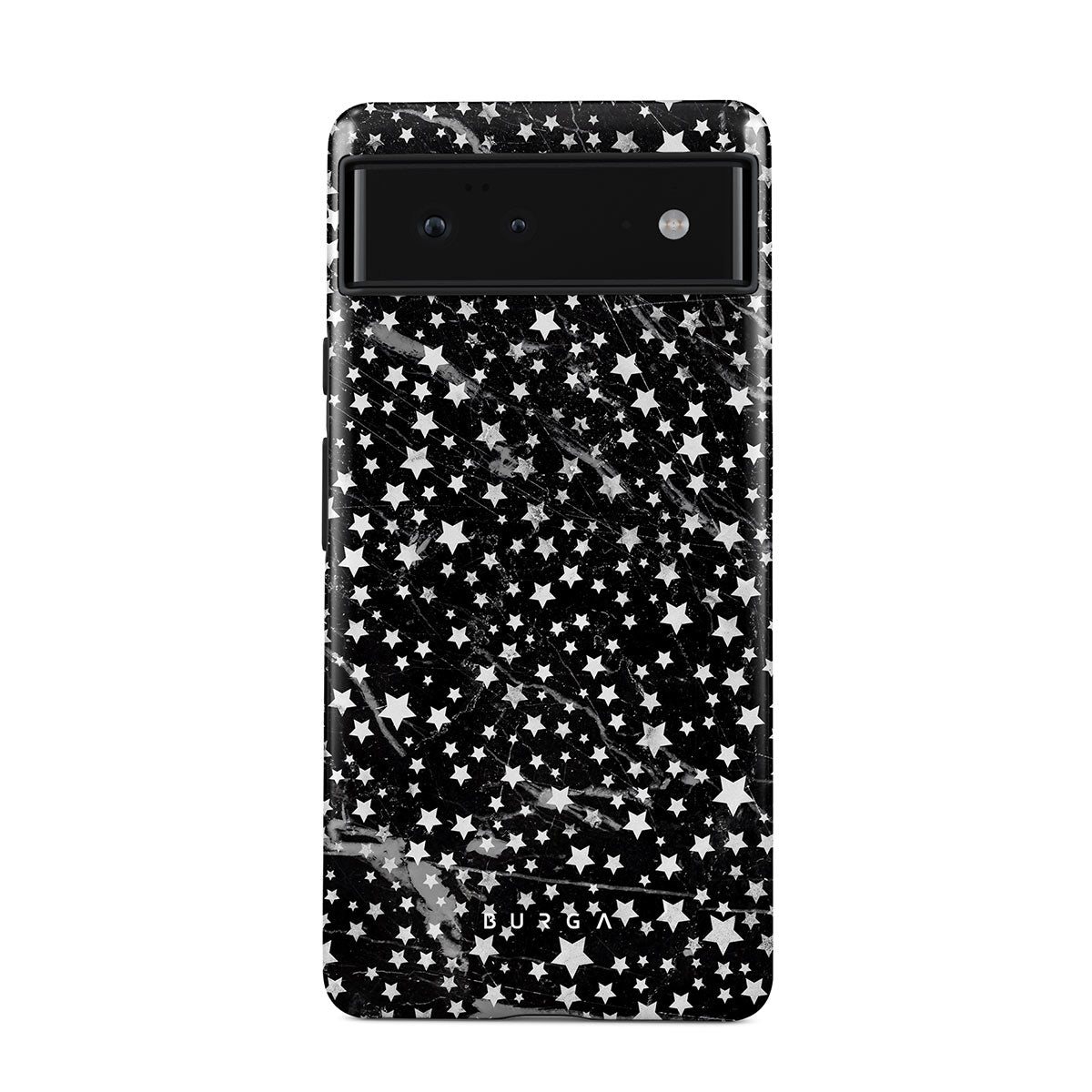 Google Pixel 6 phone case is inspired by the sky above us. Here the charming star pattern meets with a trendy black and white marble. Add the unique combination to your wardrobe and transform your protective phone case into a fashion accessory.