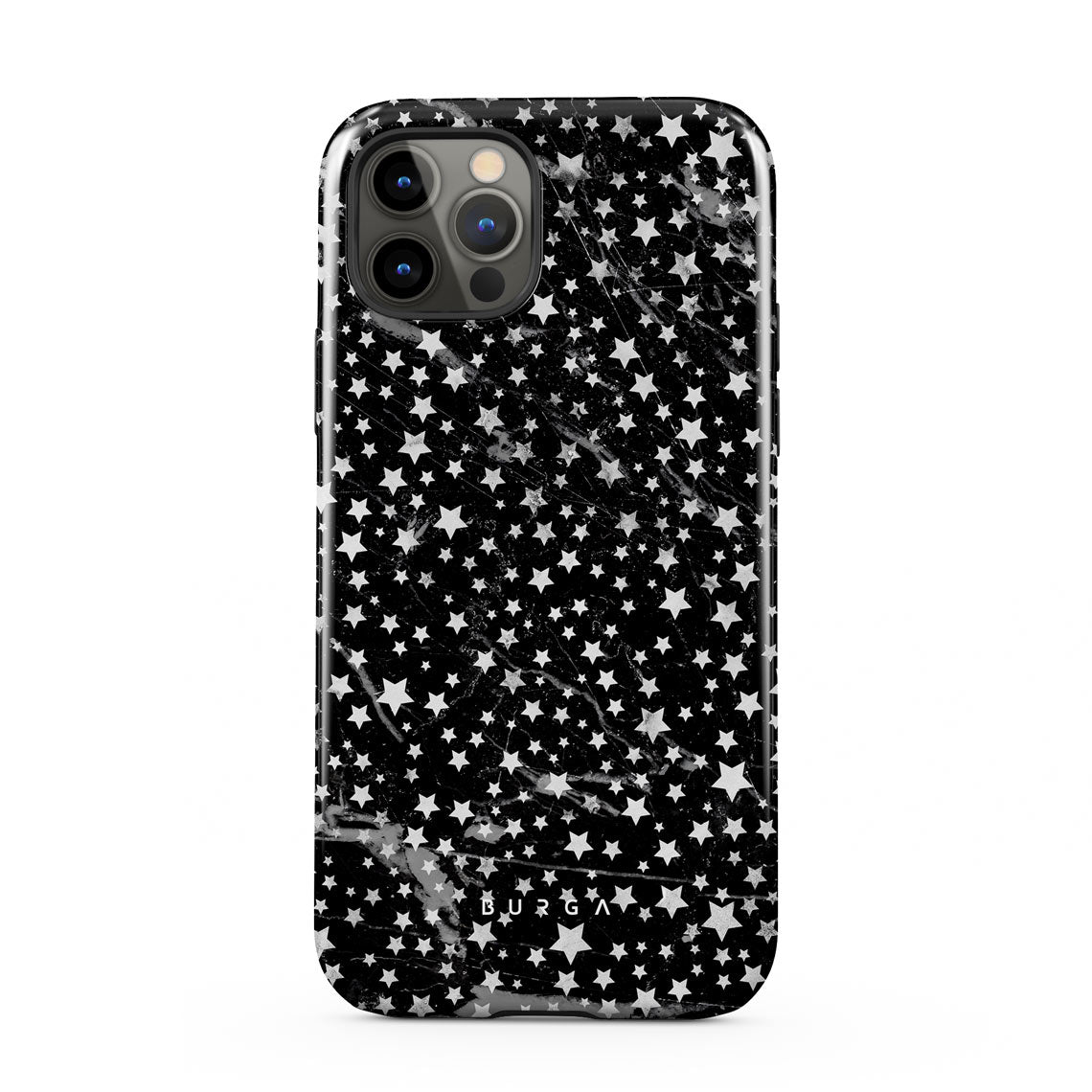 iPhone 12 Pro Max phone case is inspired by the sky above us. Here the charming star pattern meets with a trendy black and white marble. Add the unique combination to your wardrobe and transform your protective phone case into a fashion accessory.