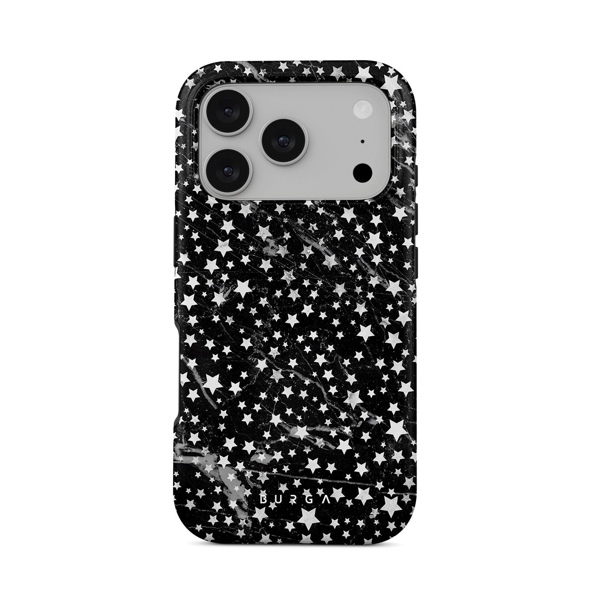 iPhone 17 Pro phone case is inspired by the sky above us. Here the charming star pattern meets with a trendy black and white marble. Add the unique combination to your wardrobe and transform your protective phone case into a fashion accessory.