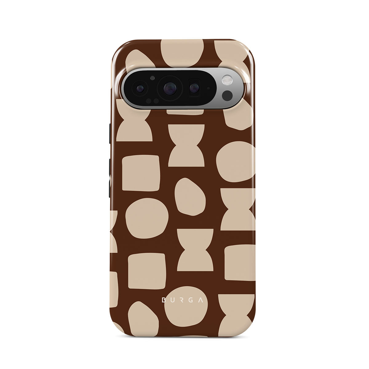 Our Terracotta Google Pixel 9 Pro phone case design whispers warmth and grounded energy. Against a rich brown background, an interplay of light shapes unfolds, captivating the eye with an array of circles, squares, and hourglasses. Each shape is a testament to the beauty found in simplicity.