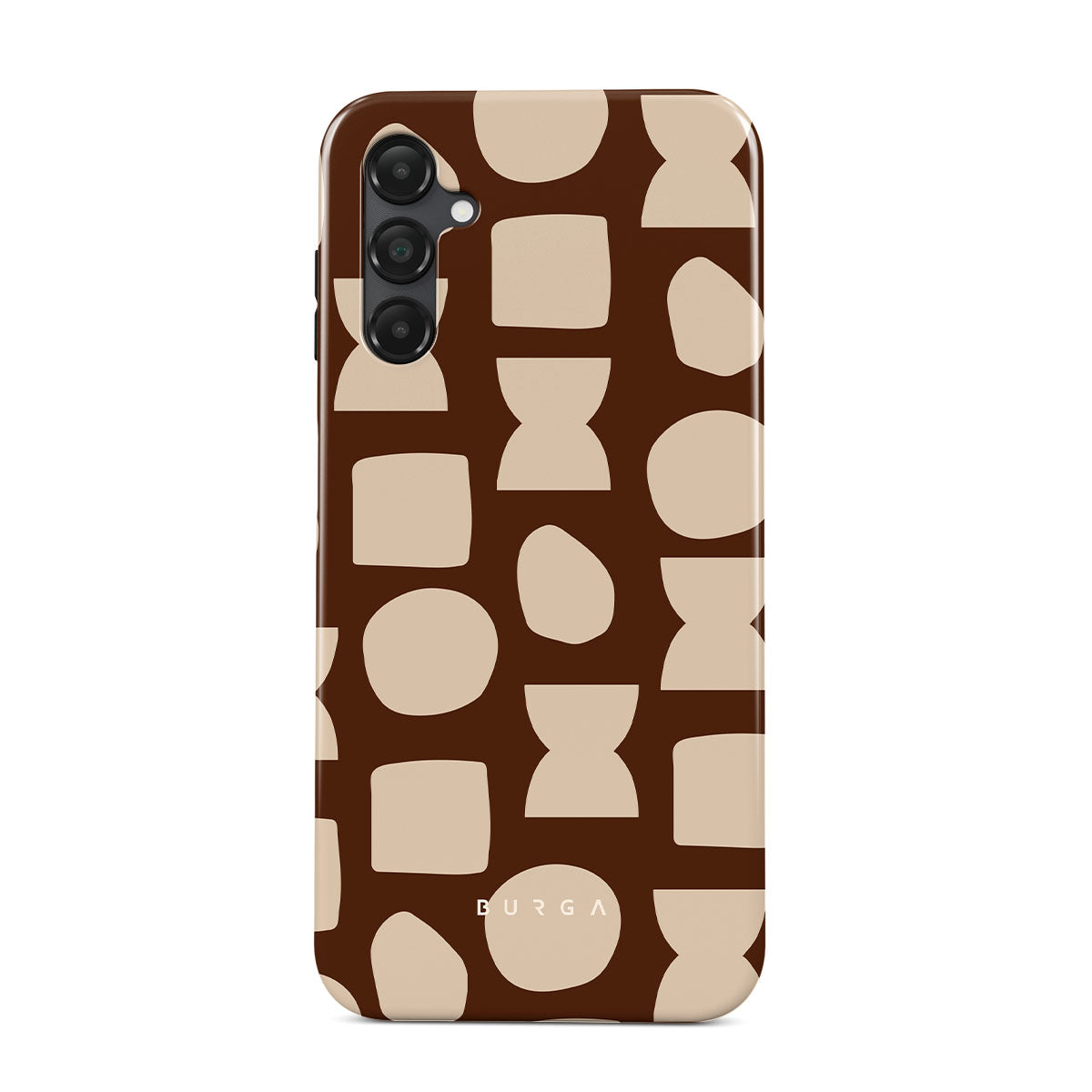 Our Terracotta Samsung Galaxy A14 5G phone case design whispers warmth and grounded energy. Against a rich brown background, an interplay of light shapes unfolds, captivating the eye with an array of circles, squares, and hourglasses. Each shape is a testament to the beauty found in simplicity.