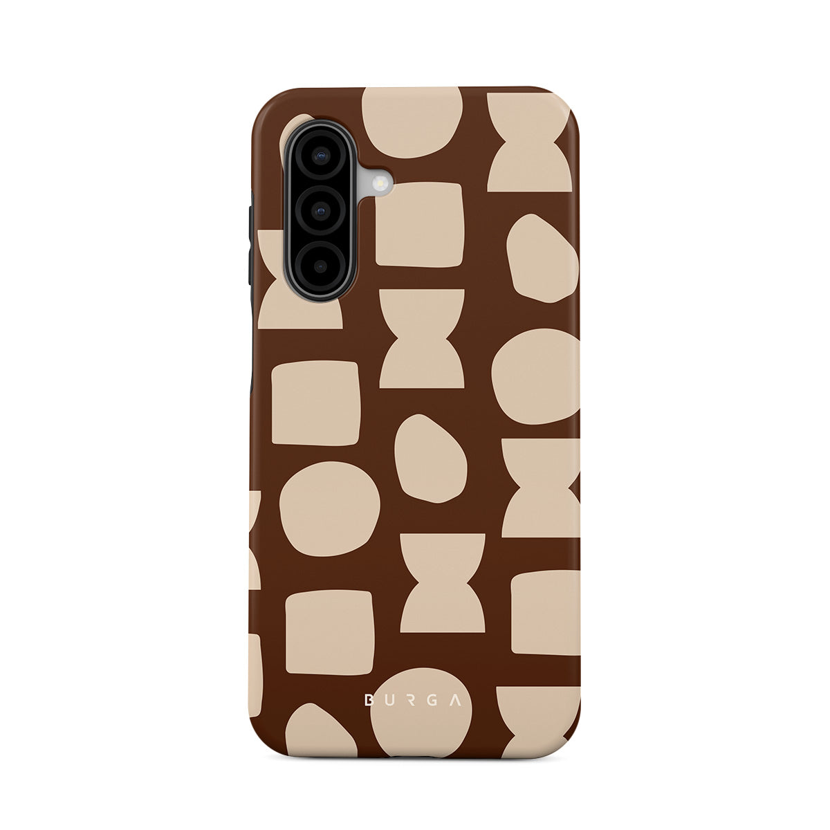 Our Terracotta Samsung Galaxy A17 phone case design whispers warmth and grounded energy. Against a rich brown background, an interplay of light shapes unfolds, captivating the eye with an array of circles, squares, and hourglasses. Each shape is a testament to the beauty found in simplicity.