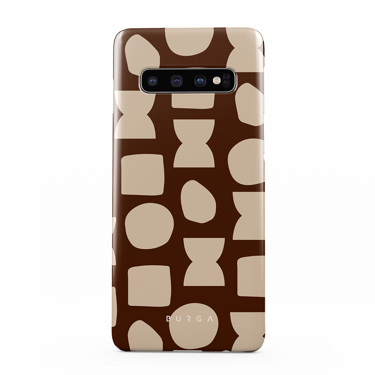 Our Terracotta Samsung Galaxy S10 Plus phone case design whispers warmth and grounded energy. Against a rich brown background, an interplay of light shapes unfolds, captivating the eye with an array of circles, squares, and hourglasses. Each shape is a testament to the beauty found in simplicity.