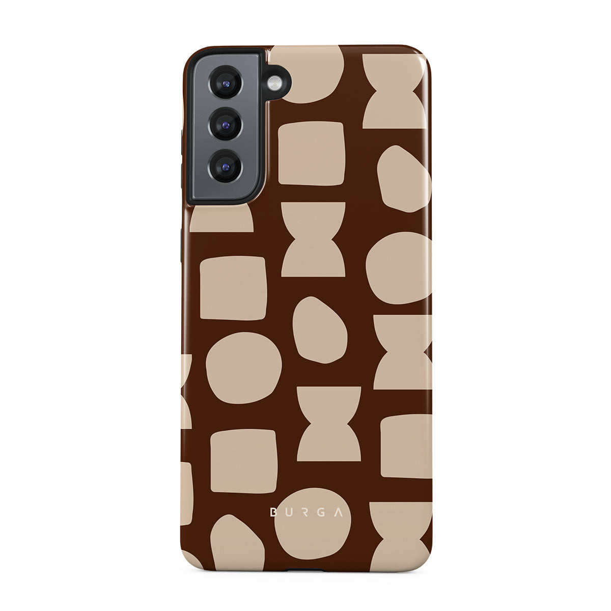 Our Terracotta Samsung Galaxy S21 phone case design whispers warmth and grounded energy. Against a rich brown background, an interplay of light shapes unfolds, captivating the eye with an array of circles, squares, and hourglasses. Each shape is a testament to the beauty found in simplicity.