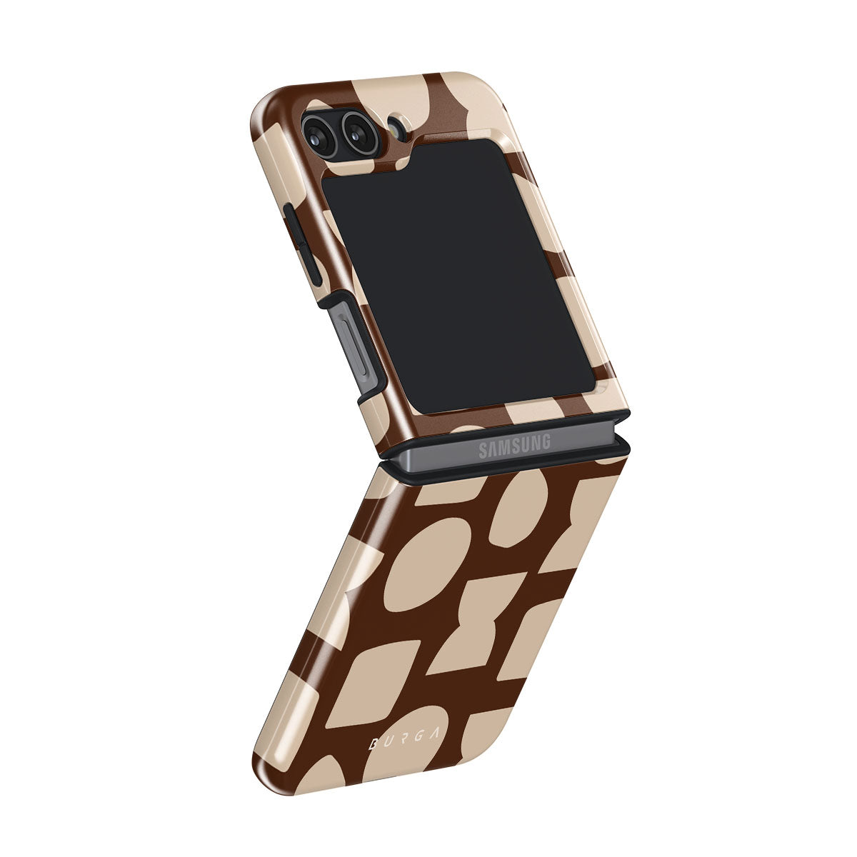 Our Terracotta Samsung Galaxy Z Flip 5 phone case design whispers warmth and grounded energy. Against a rich brown background, an interplay of light shapes unfolds, captivating the eye with an array of circles, squares, and hourglasses. Each shape is a testament to the beauty found in simplicity.