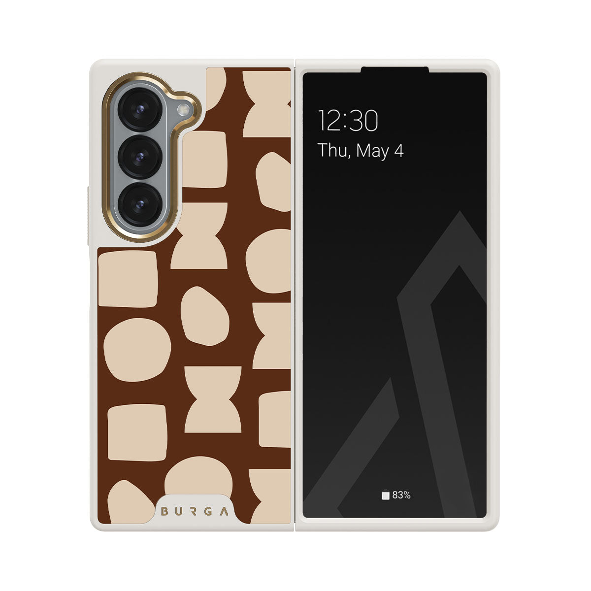 Our Terracotta Samsung Galaxy Z Fold 6 phone case design whispers warmth and grounded energy. Against a rich brown background, an interplay of light shapes unfolds, captivating the eye with an array of circles, squares, and hourglasses. Each shape is a testament to the beauty found in simplicity.