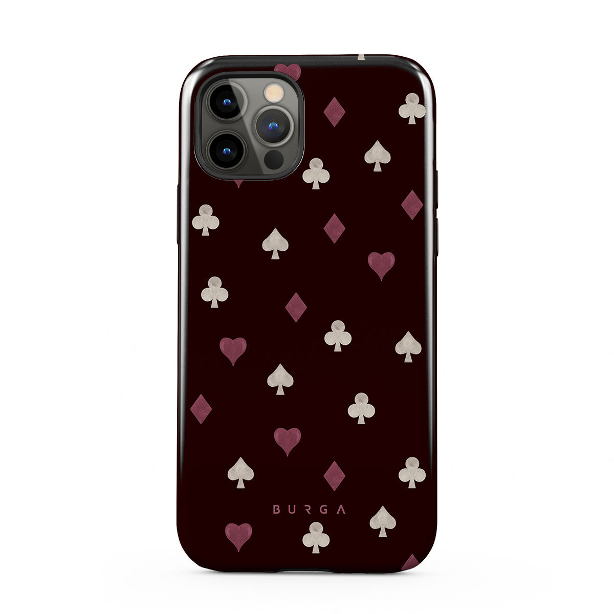 Nothing is as it appears. Hearts, clubs, diamonds, and spades—stacked in your favor or playing against you? This iPhone 12 Pro Max phone case design features a rich burgundy background and minimalist suits that make for a game where the rules are constantly shifting.