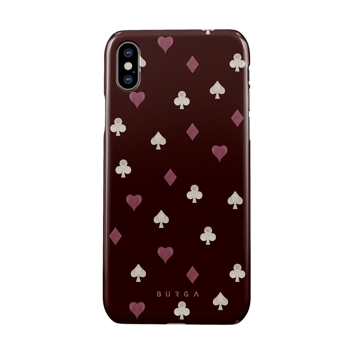 Nothing is as it appears. Hearts, clubs, diamonds, and spades—stacked in your favor or playing against you? This iPhone XS Max phone case design features a rich burgundy background and minimalist suits that make for a game where the rules are constantly shifting.