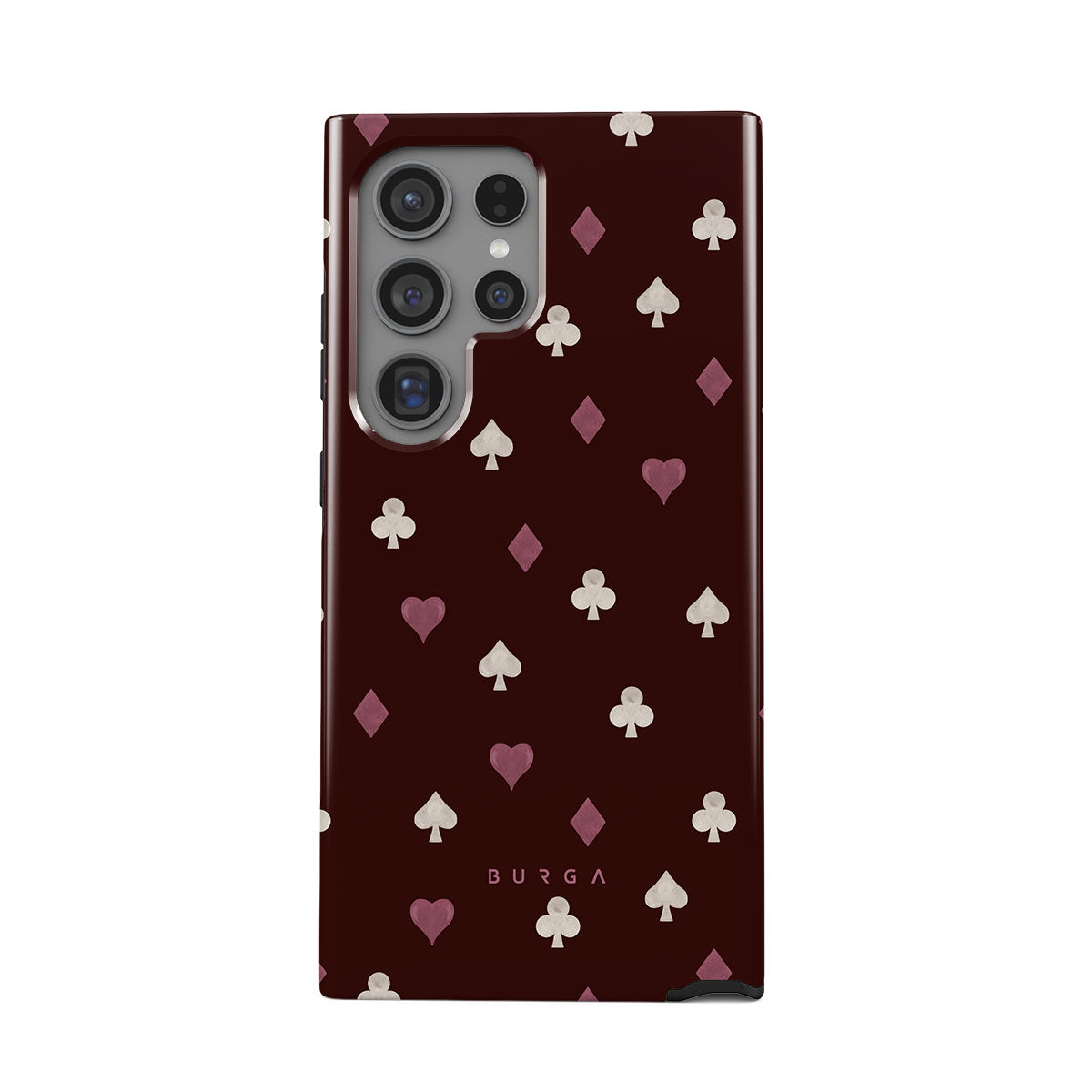 Nothing is as it appears. Hearts, clubs, diamonds, and spades—stacked in your favor or playing against you? This Samsung Galaxy S24 Ultra phone case design features a rich burgundy background and minimalist suits that make for a game where the rules are constantly shifting.