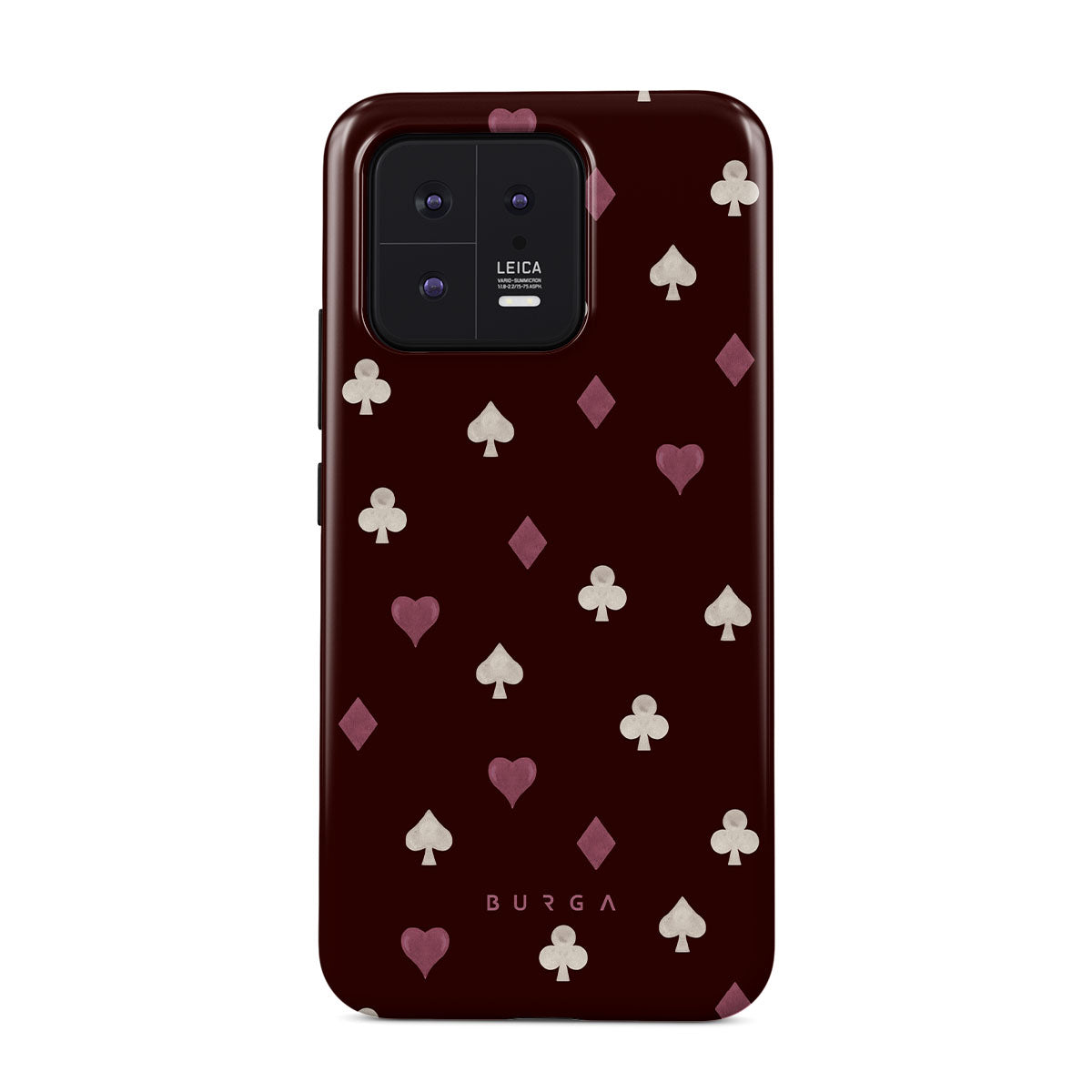 Nothing is as it appears. Hearts, clubs, diamonds, and spades—stacked in your favor or playing against you? This Xiaomi 13 phone case design features a rich burgundy background and minimalist suits that make for a game where the rules are constantly shifting.