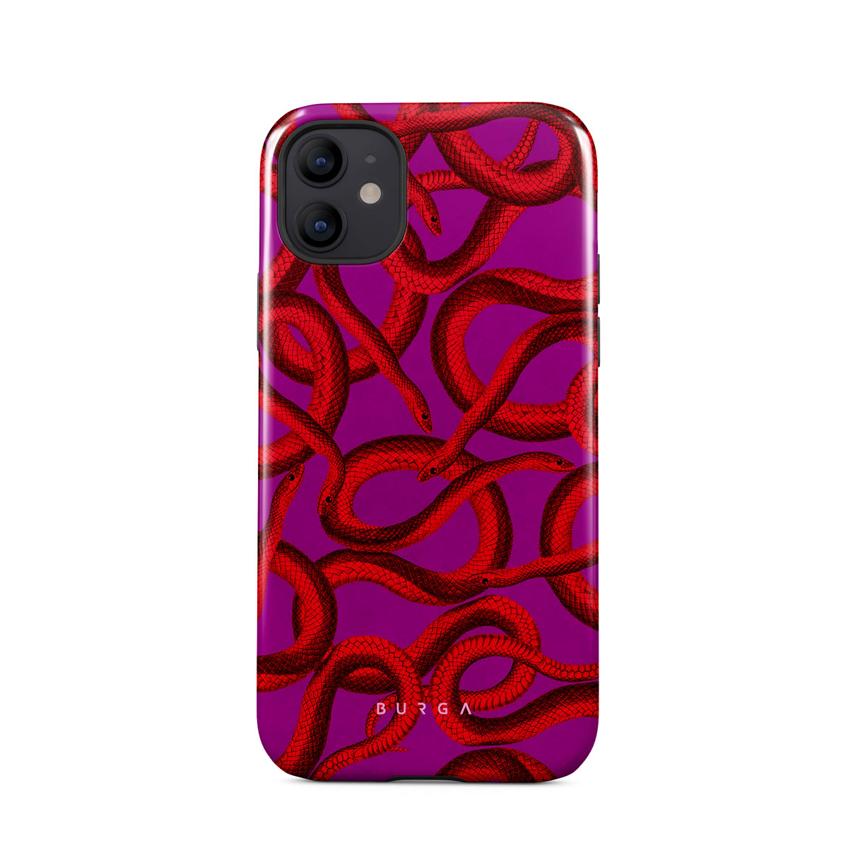Watch Out iPhone 12 phone case design offers a fierce feel with a bright magenta colored background covered in red snakes pattern. Make a statement while protecting your phone, as this case is guaranteed to catch everyone's eye.