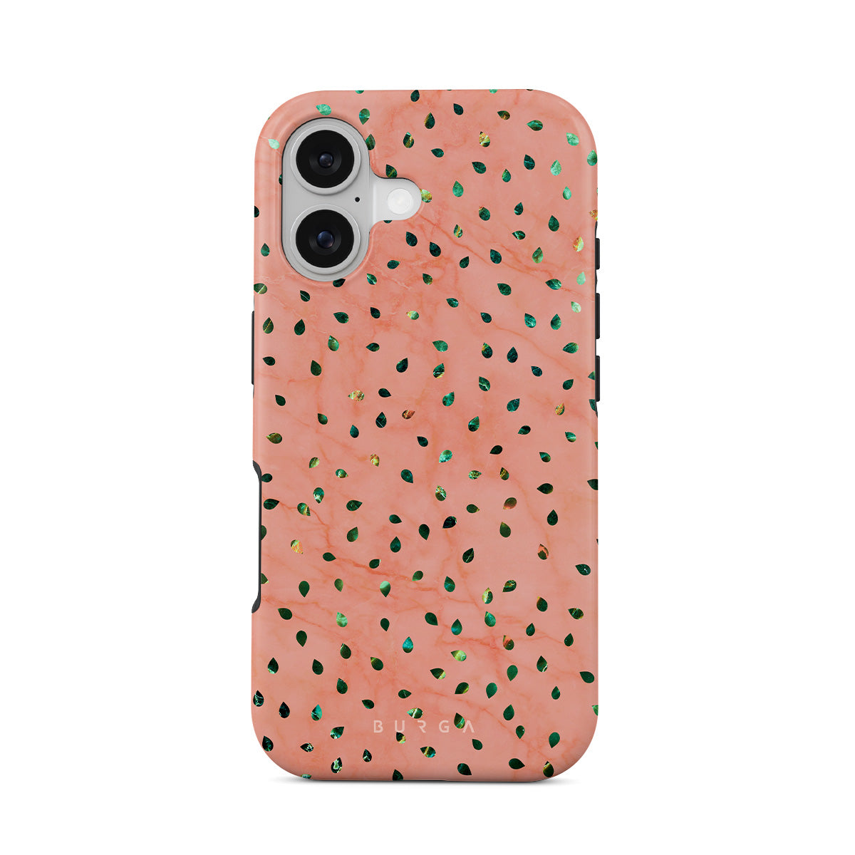 The Watermelon Shake iPhone 17 phone case offers a playful take on design merging. The watermelon seed-like specks showcase striking tropical design fragments that add a splash of color to the fresh and breezy coral pink marble. This way, the funny protective phone cover becomes a perfect statement piece for your summer outfits.