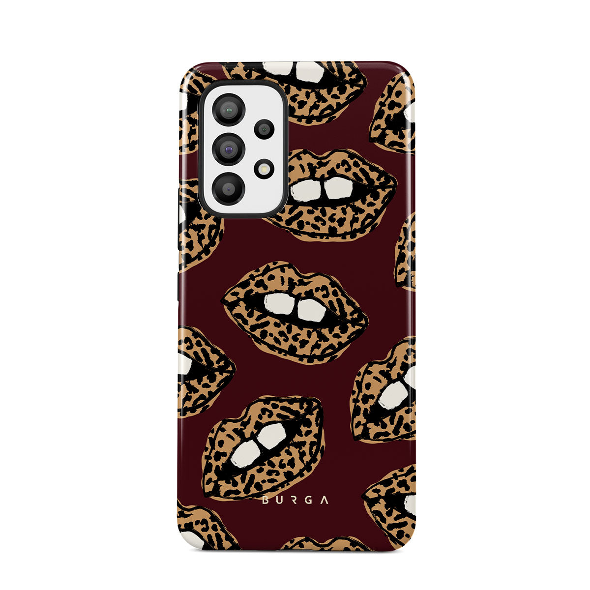 This design features: leopard print, lips, open lips, colored lips